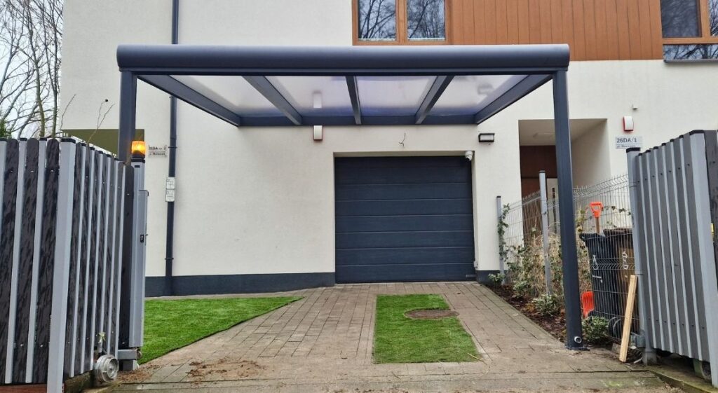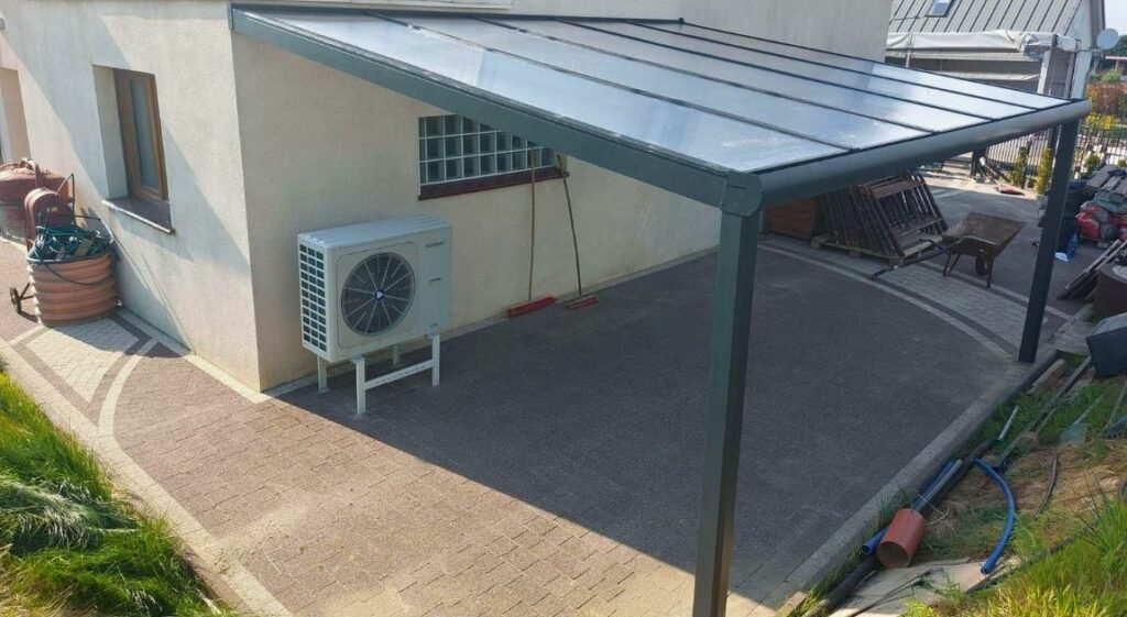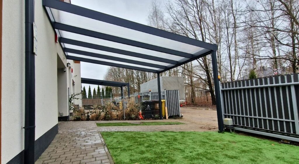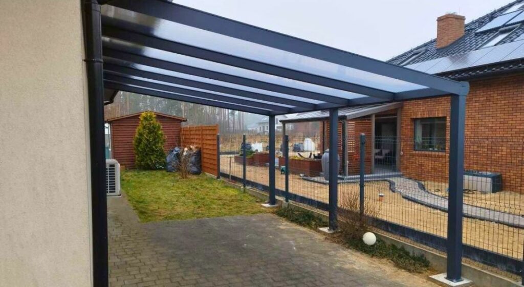 - Zadaszenia z poliwęglanu – komorowy poliwęglan (16 mm) zapewnia doskonałą ochronę przed promieniowaniem UV i opadami atmosferycznymi, jednocześnie przepuszczając naturalne światło.